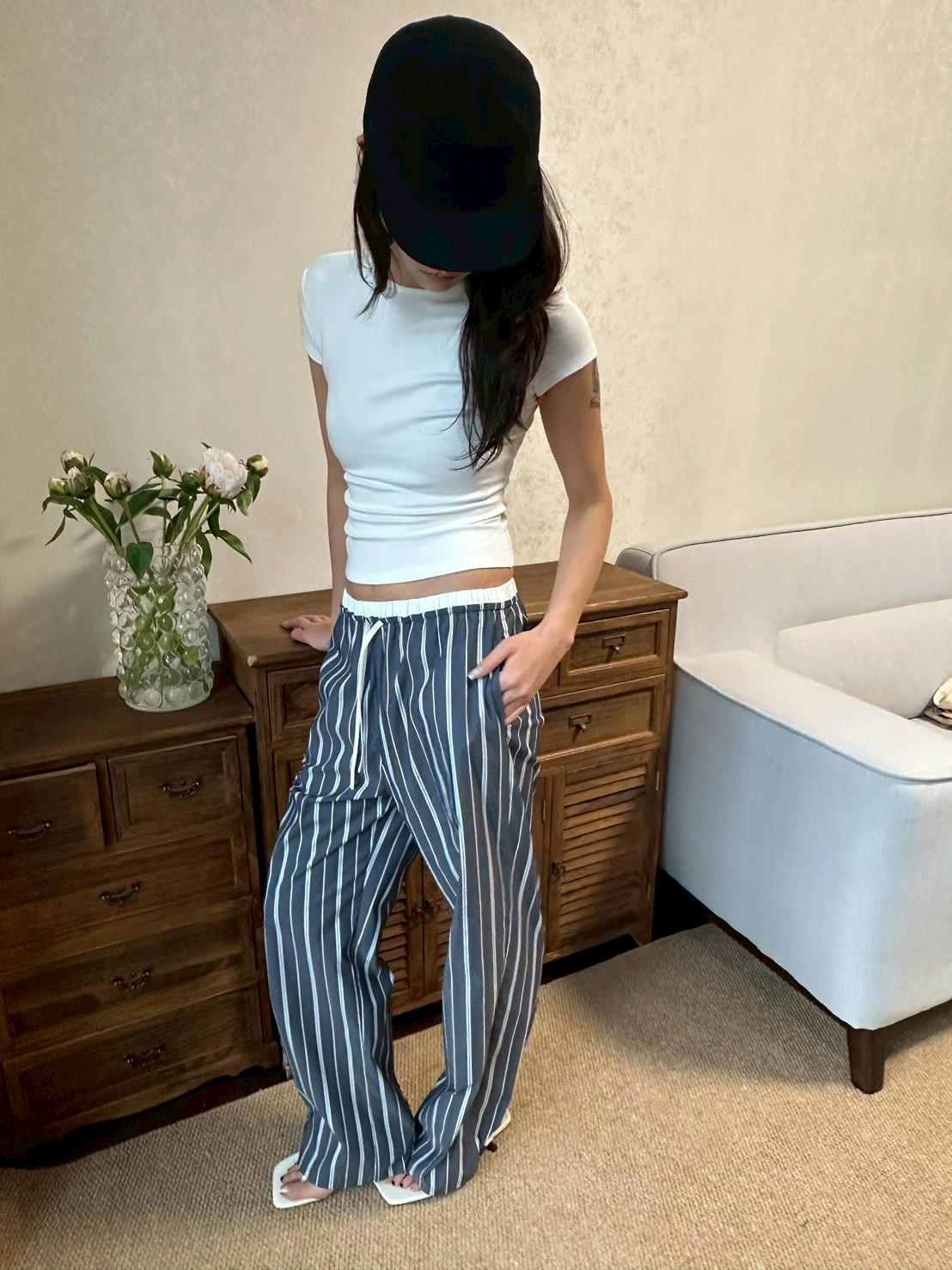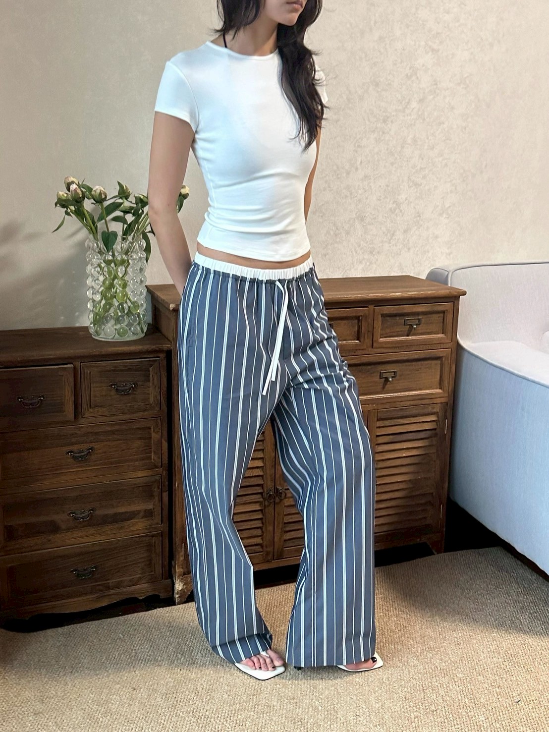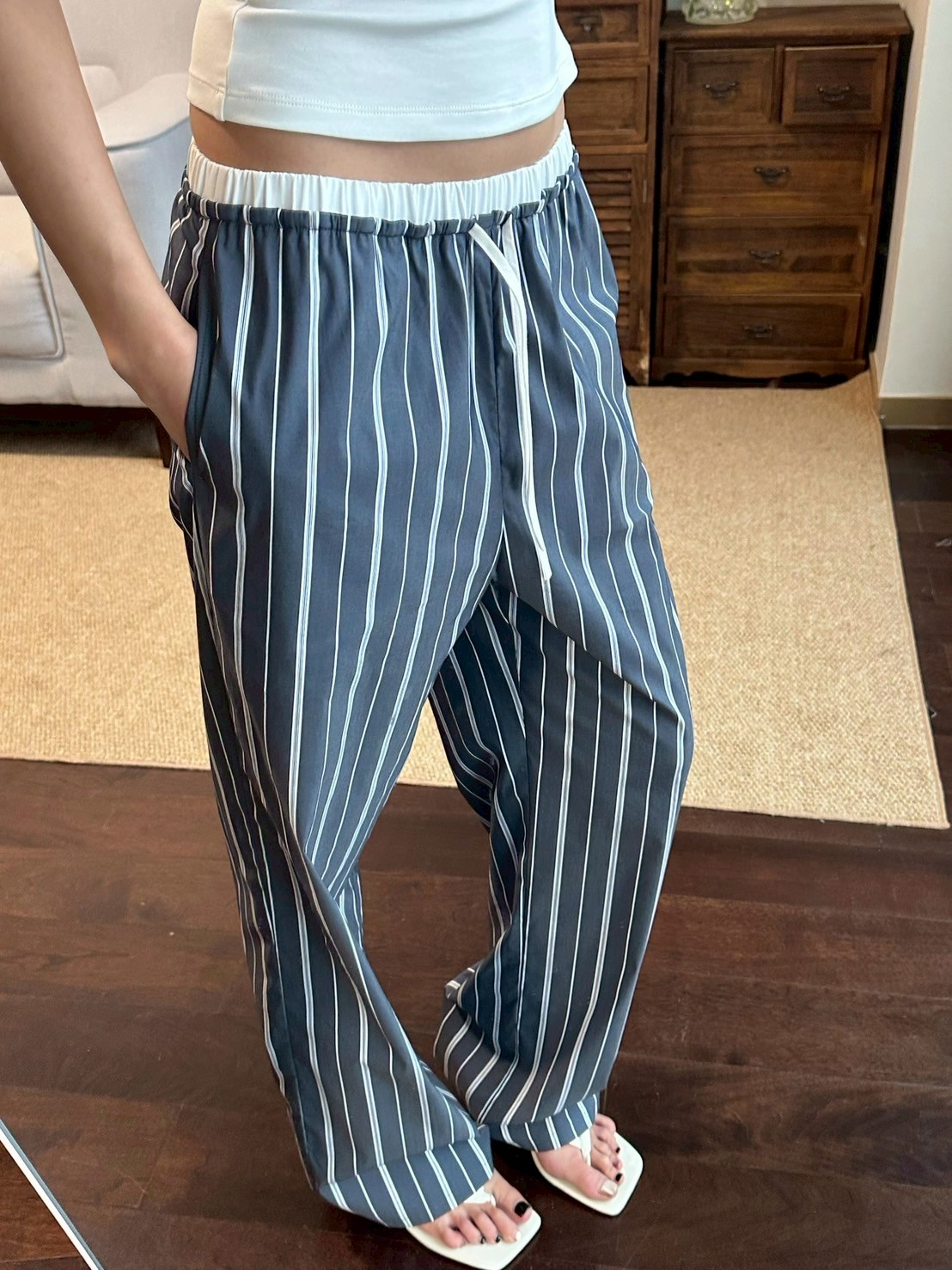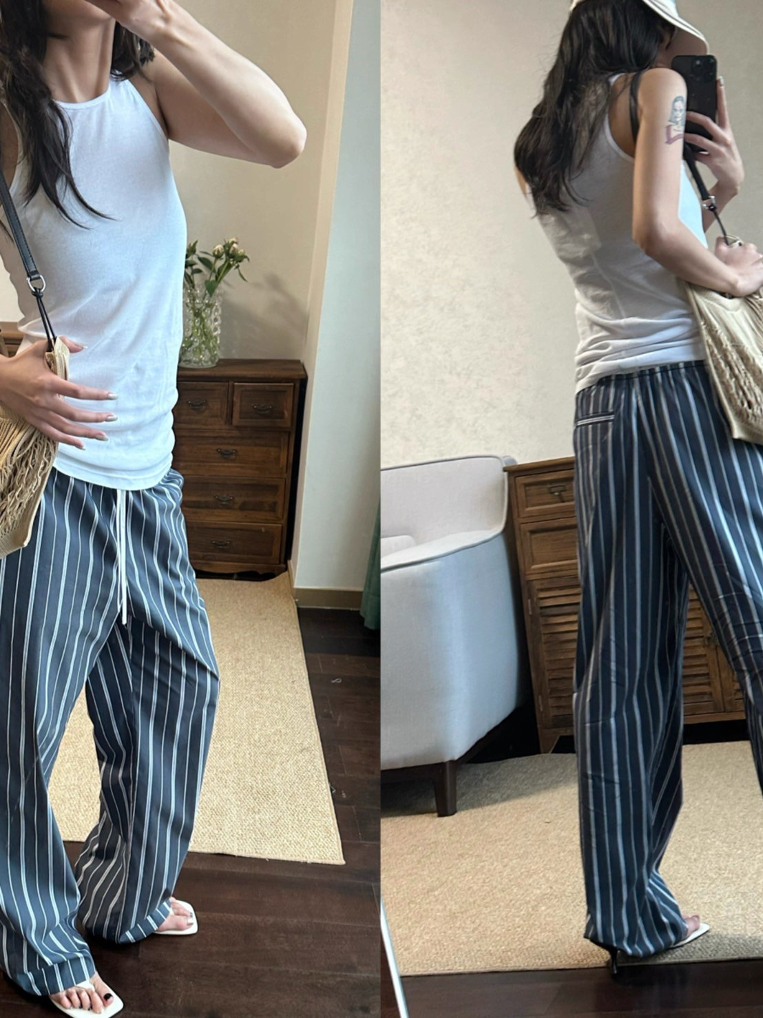 休閒運動條紋寬鬆直筒褲遛彎褲