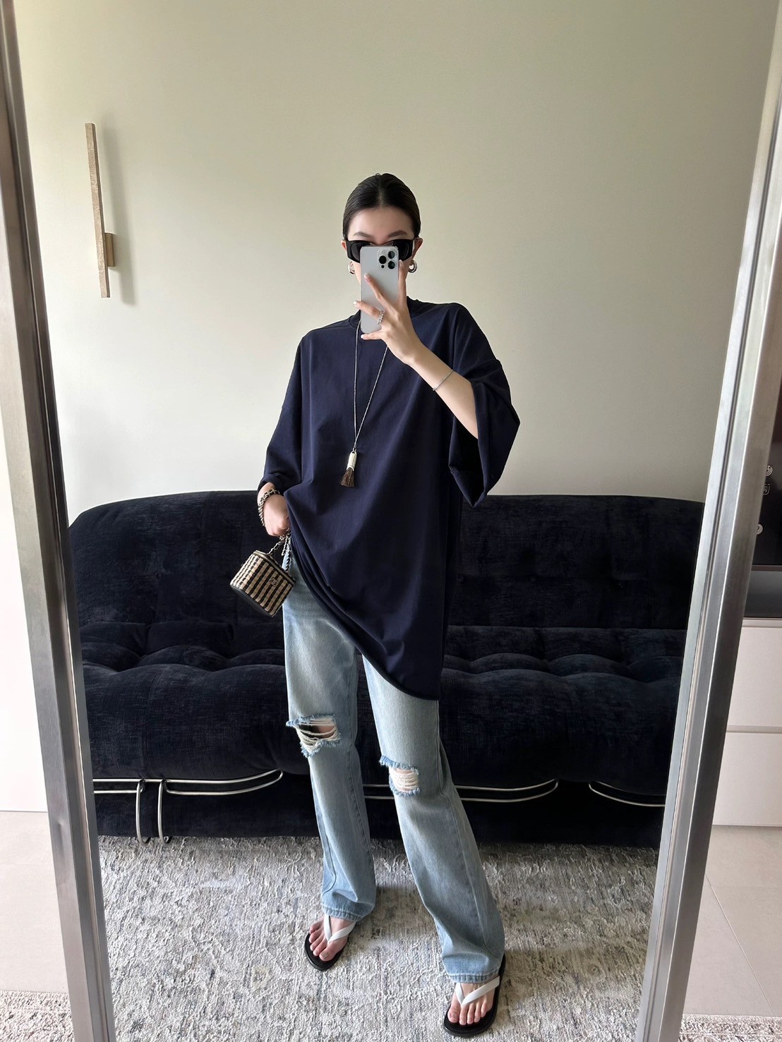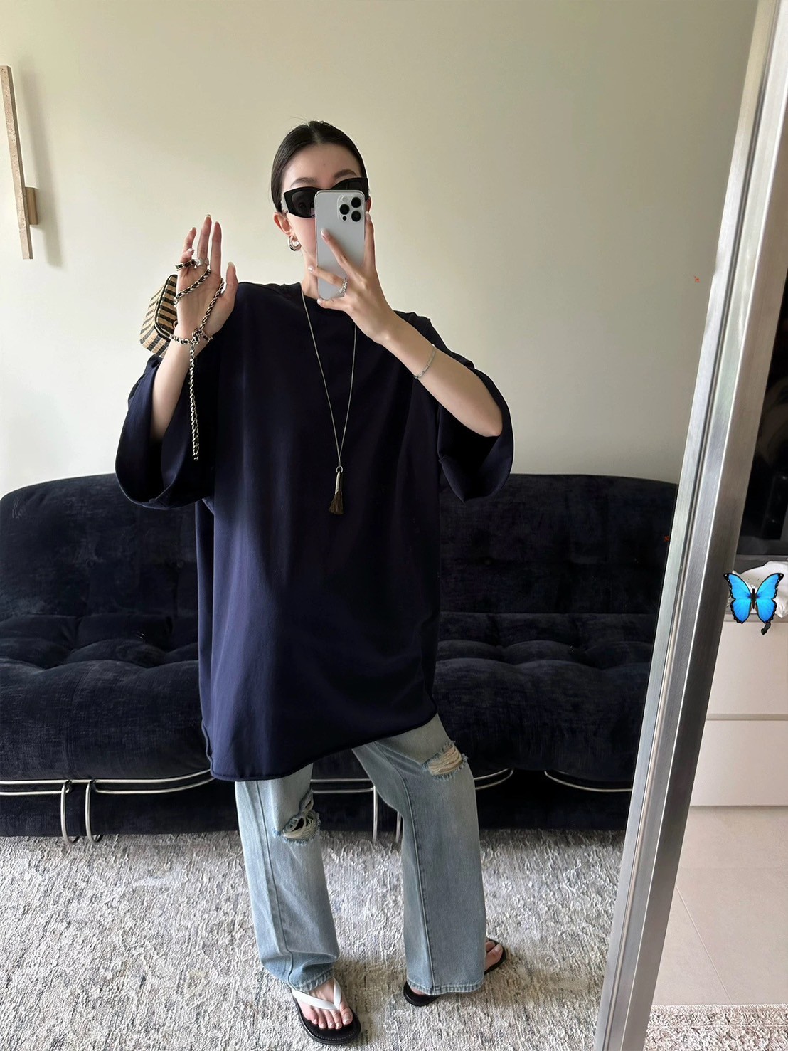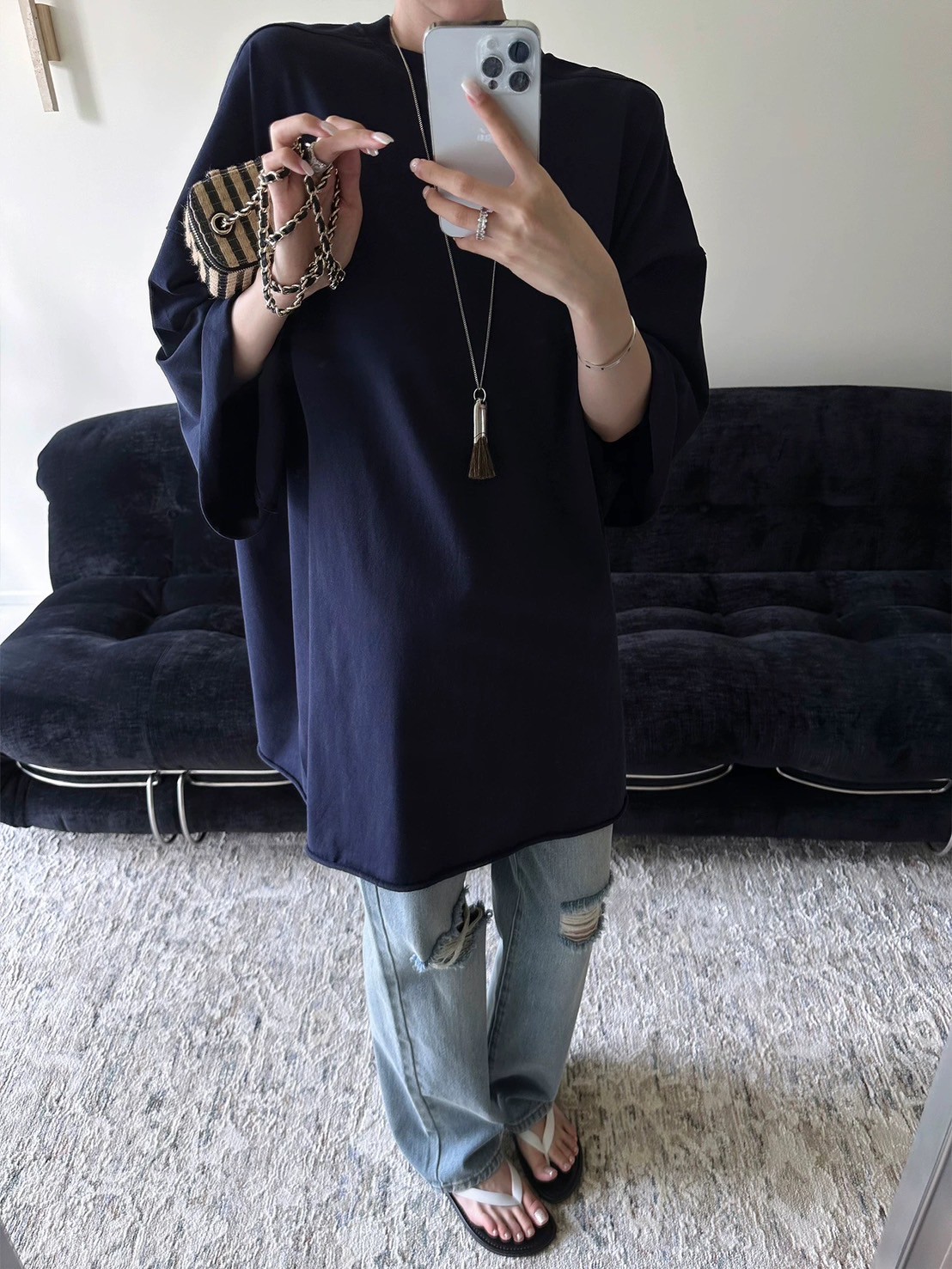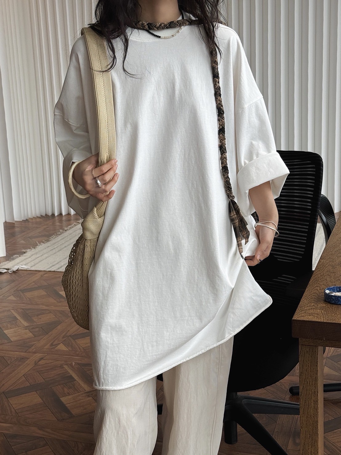 大落肩空氣感輪廓中長T恤捲邊短袖上衣