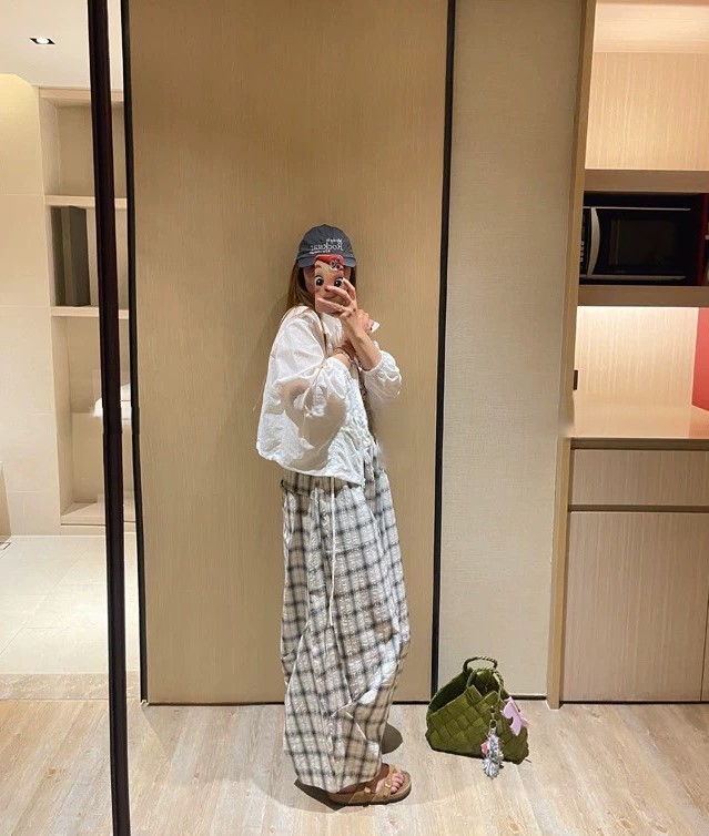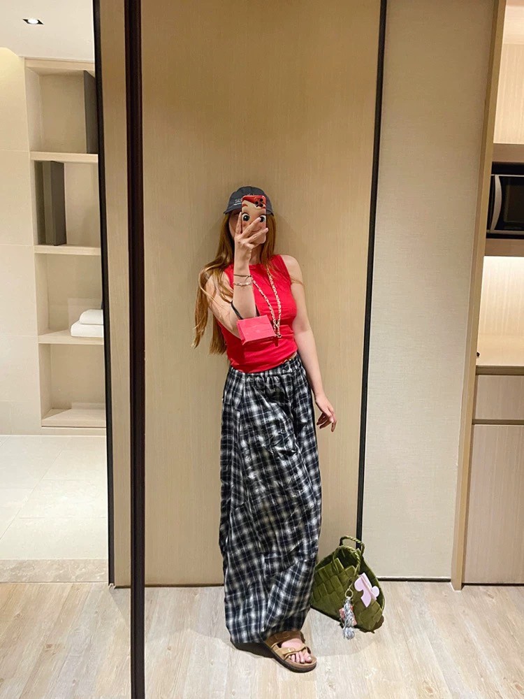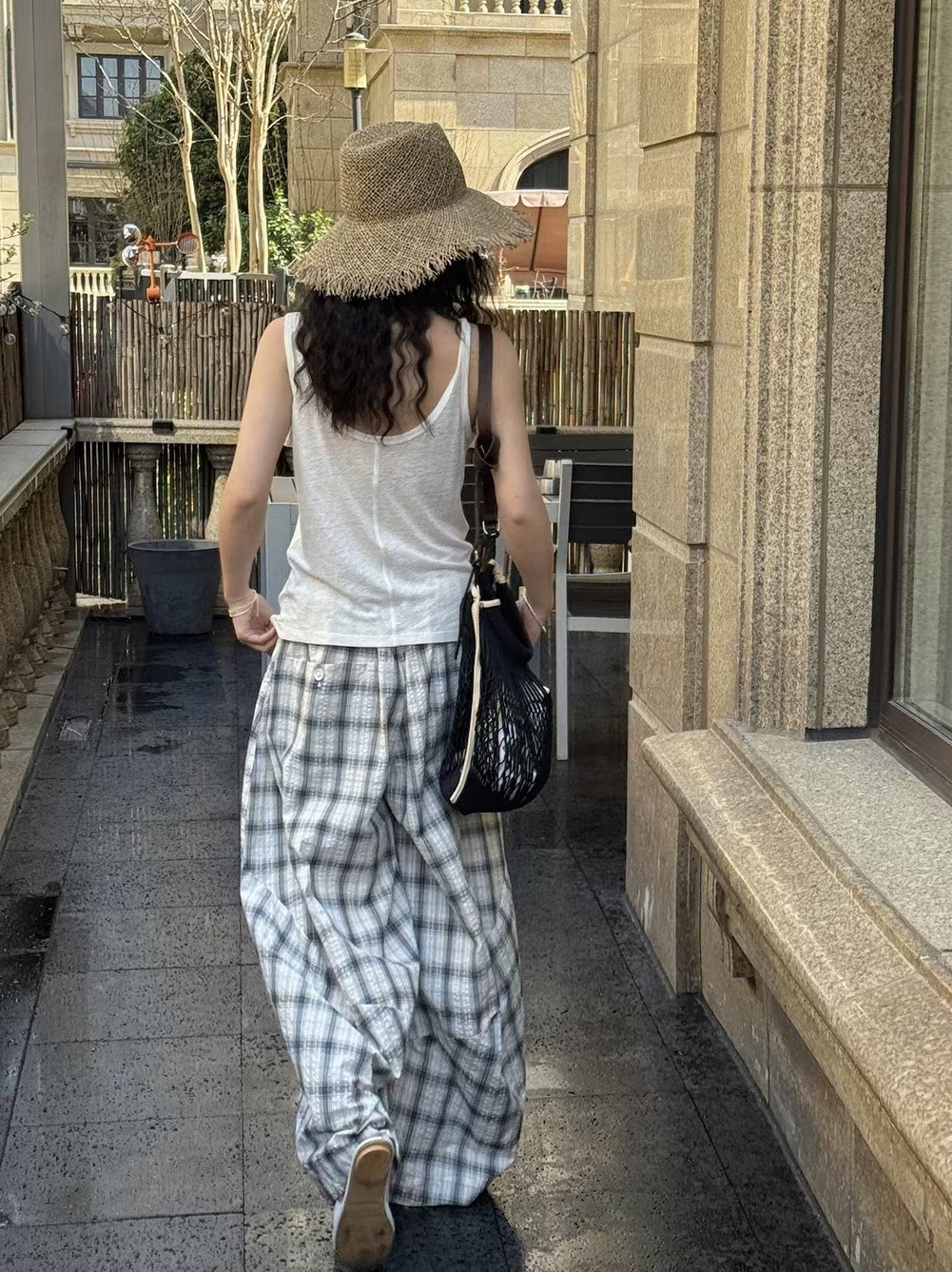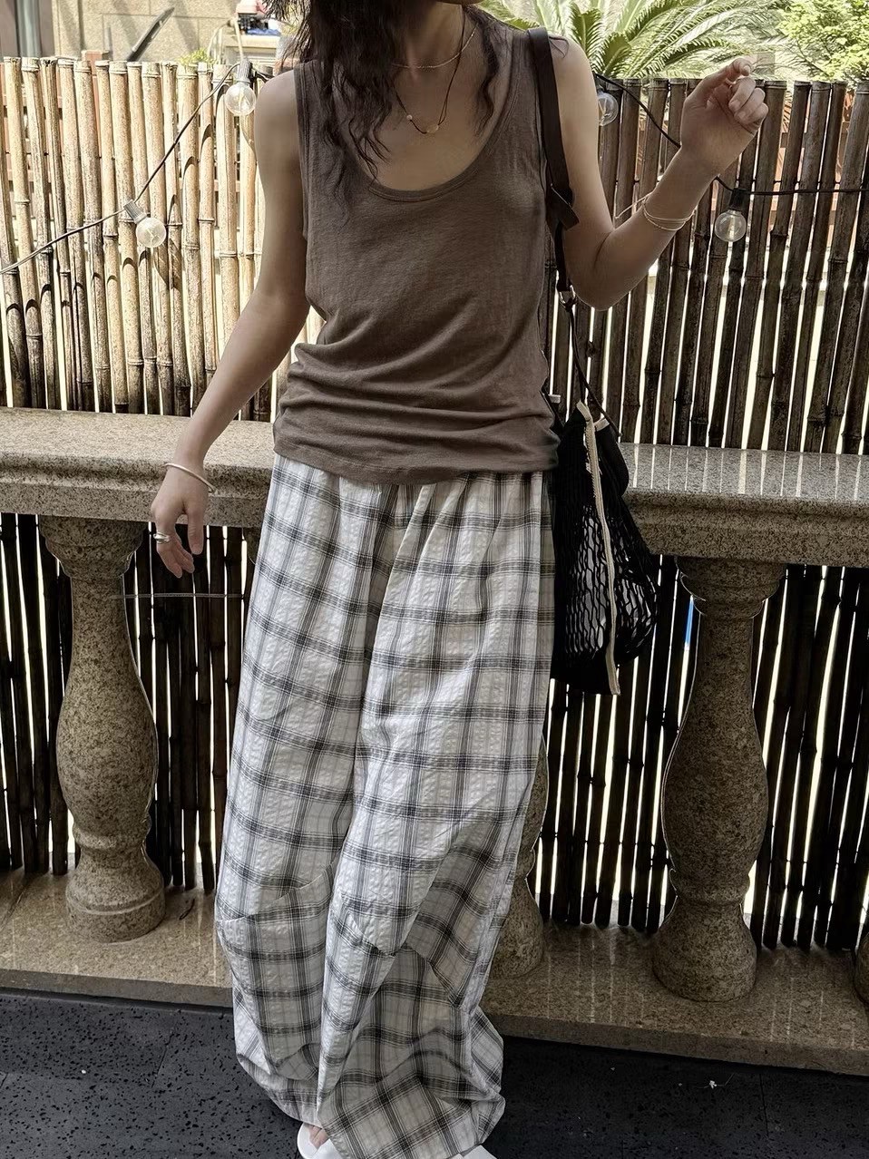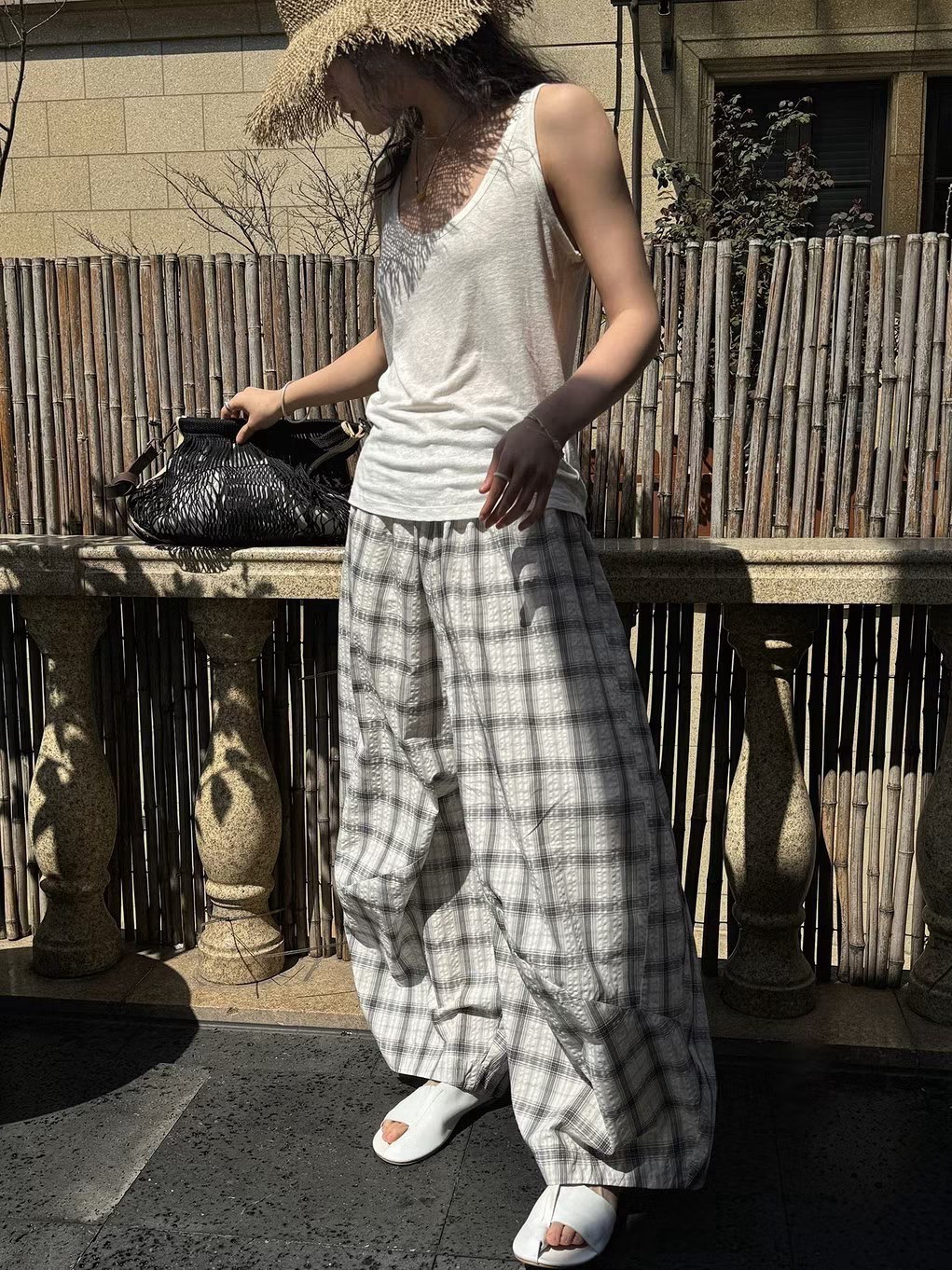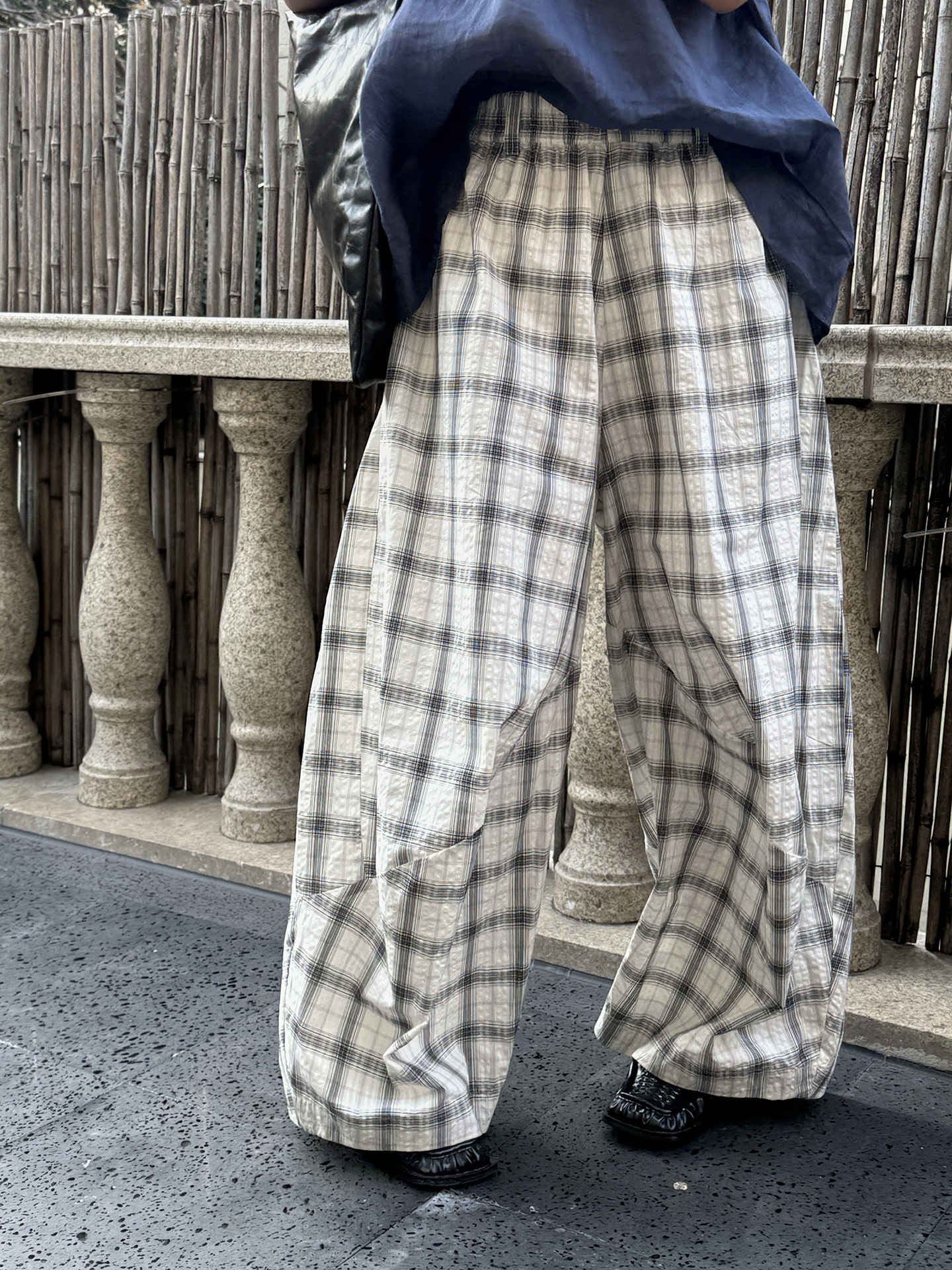 格紋復古紋燈籠輪廓肌理感輕薄長褲