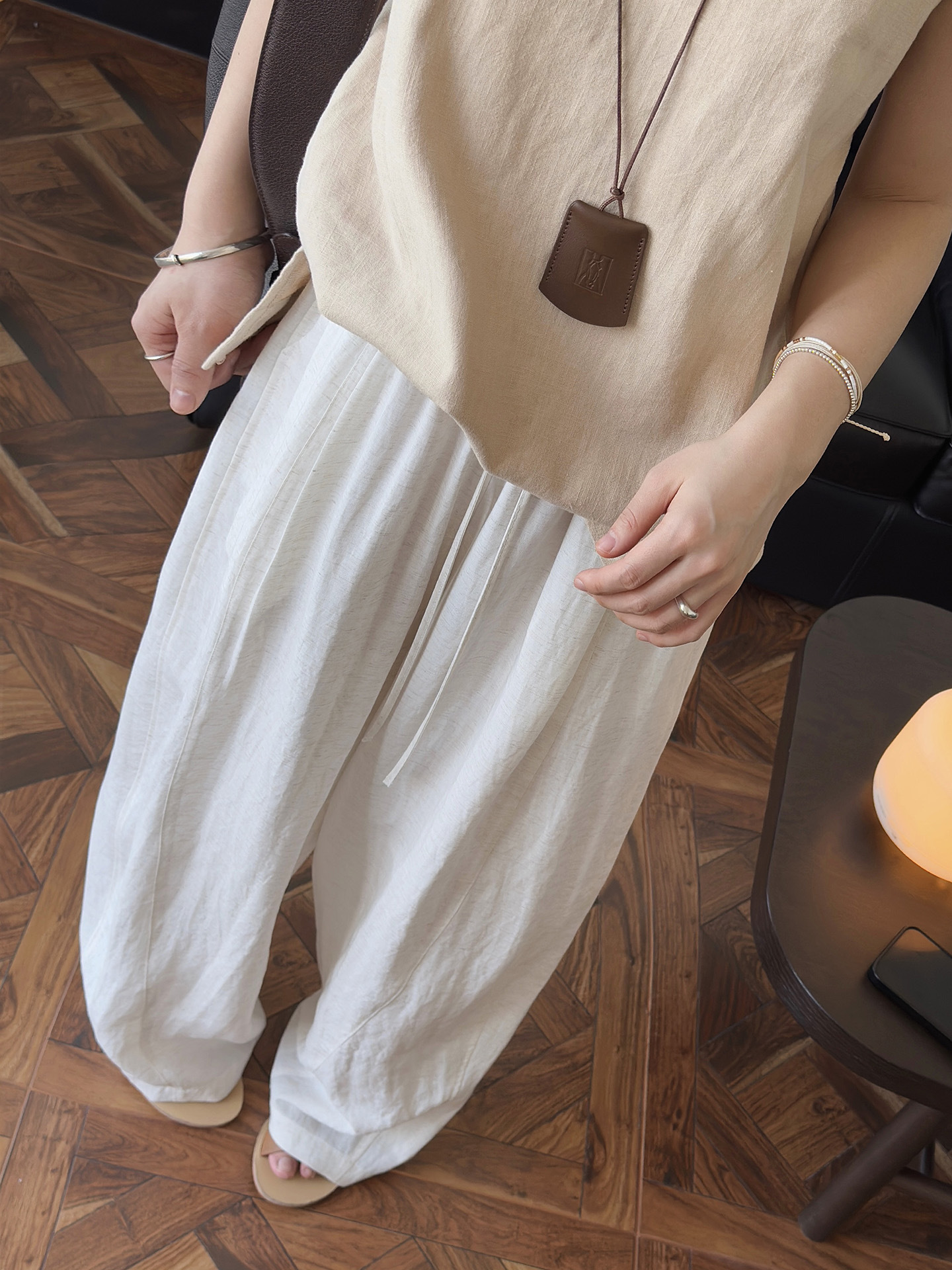 面料 / 47%天絲38%人棉9%錦綸6%亞麻 參考尺寸CM S 腰圍 66 臀圍 134 褲長 98 腿圍 85 M 腰圍 70 臀圍 138 褲長 100 腿圍 87 模特 :164/48 適合S 含天絲材質 上身舒適清涼 手感柔軔緊緻 有筋骨感 色澤柔和還原了天然風格 顏色 預購 – 粉色, 預購 – 白色, 預購 – 藏青色 尺寸 S, M