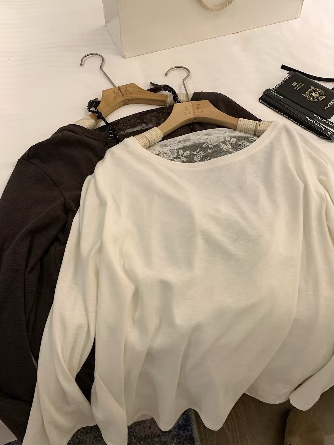 面料 / 豚竹節 尺寸 /CM S 胸圍116 衣長67 M 胸圍120 衣長68 L 胸圍124 衣長69 模特 :162/48 拍照穿s<介於尺寸拿大> 領口處採用的蕩領的設計 和背部的蕾絲露背相呼應 跳脫出單調無聊,漏出背部線條 營造優雅簡約氛圍 下擺 袖口自然垂順無收緊 約至手部虎口,袖長 視覺顯手臂修長 自帶鬆弛感。軟糯舒適蕩領設計 布料柔軟舒服有垂感 顏色 預購 – 黑荼色, 預購 – 白色 尺寸 S, M, L